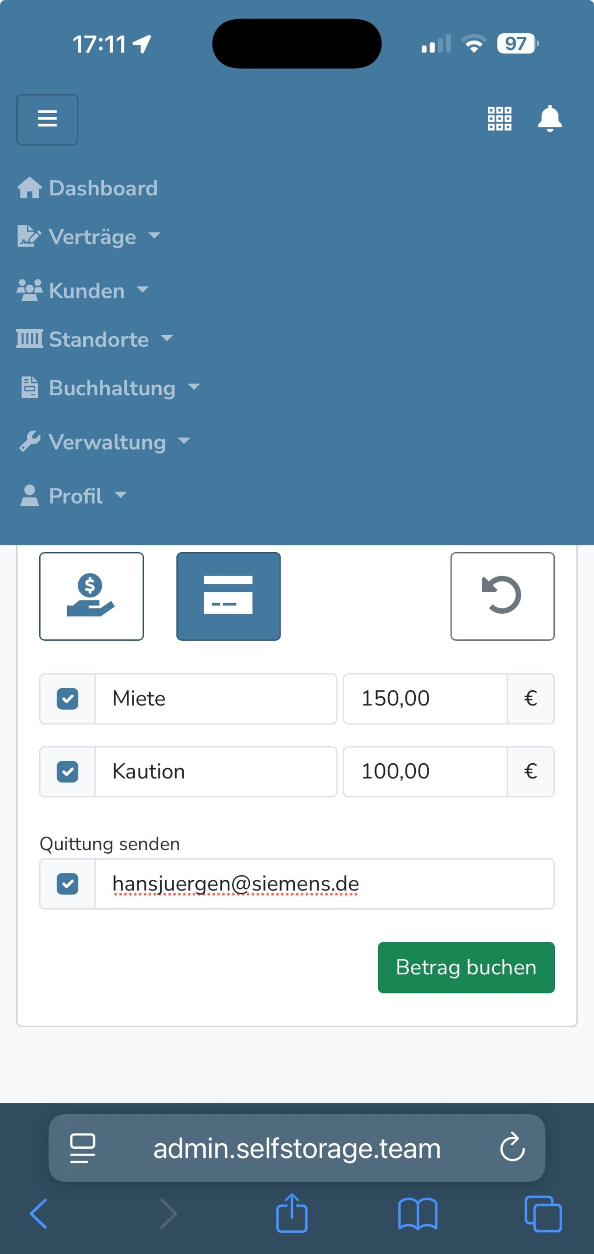 Alle Funktionen sind optimiert für mobile Endgeräte: Sie können die gesamte Lagerverwaltung über Ihr Mobilfunkgerät vor Ort machen, Verträge unterschreiben lassen, Boxen buchen oder Verträge beenden.